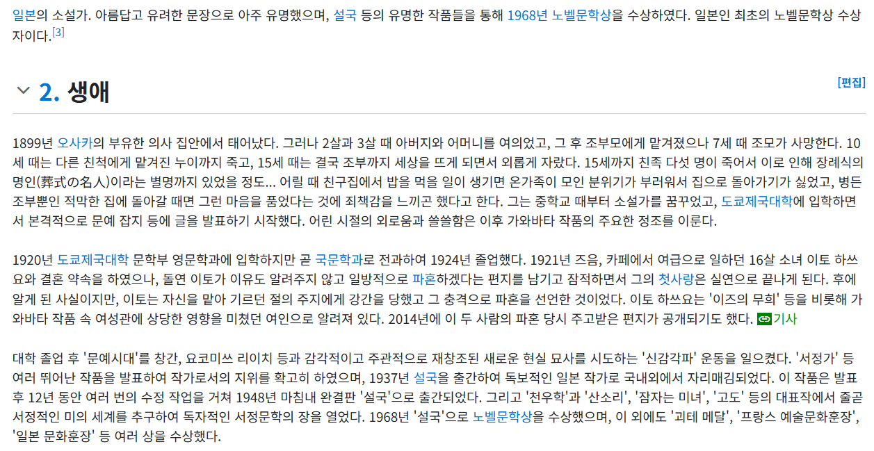 수상 연설 "나는 아름다움 속에서 살고 싶다"(美しい日本の私)에서는 일본인의 정서와 미학에 대한 철학을 담담히 고백하며 세계인의 찬사를 받았습니다.